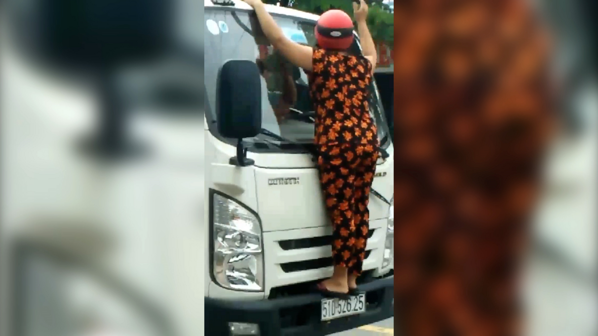 Clip: Người phụ nữ trèo lên đầu xe tải, bẻ gãy cần gạt mưa