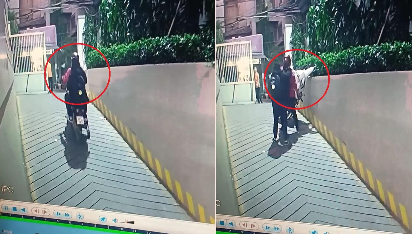 Cô gái nhấn ga khi lên dốc cao khiến xe máy bốc đầu dựng đứng rồi mắc kẹt trên bờ tường, may mắn được nam thanh niên qua đường chạy tới giải cứu.