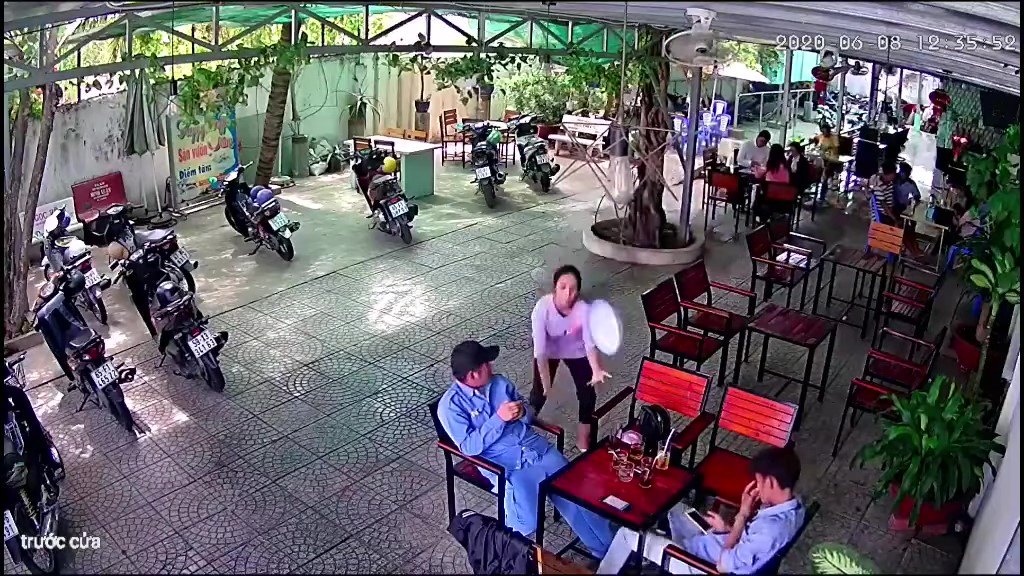 Đang tung tăng nhảy chân sáo bê đồ cho khách, cô gái đánh rơi cái khay khiến nước trong ly đổ hết vào người khách hàng.
