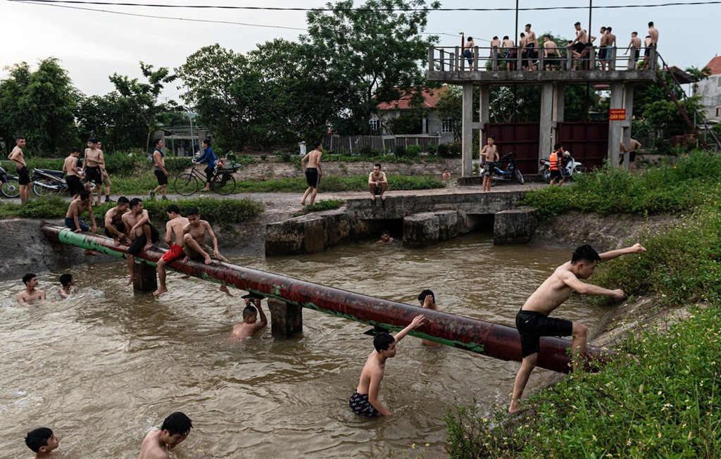 Hàng trăm thanh thiếu niên rủ nhau về mương nước Hồng Vân (thôn Sở Hạ, Ninh Sở, Thường Tín, Hà Nội) tắm giải nhiệt vì nắng nóng.