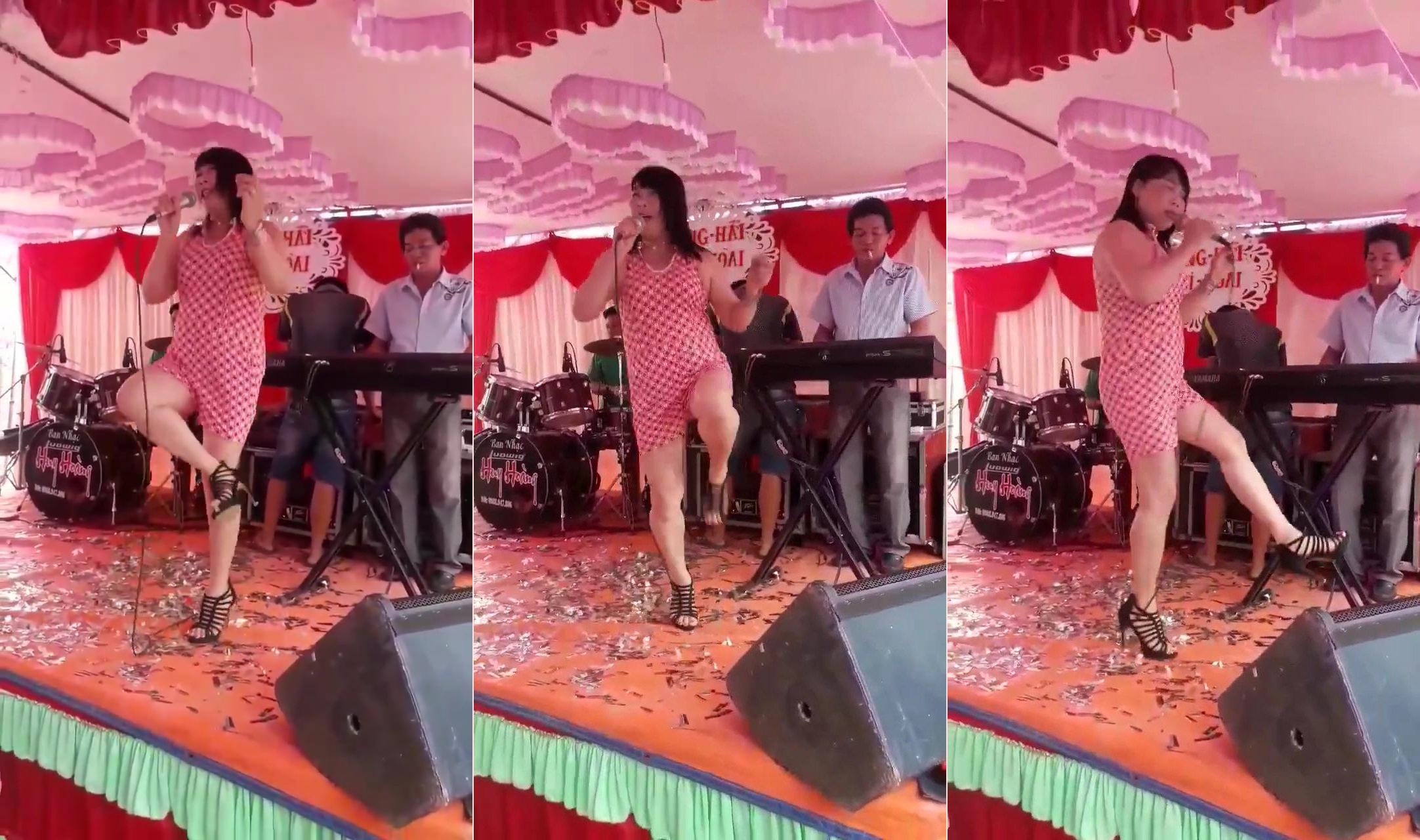 Có vẻ như vừa nhảy lò cò vừa hát là phong cách đặc trưng của người phụ nữ này. Cuối tháng 4, clip ghi lại màn biểu diễn tương tự của cô cũng một phen "làm mưa làm gió" trên mạng xã hội.