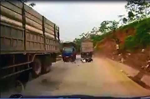 Sau khi vượt qua ô tô, chiếc xe máy này tiếp tục lao với tốc độ nhanh thì gặp một chiếc xe tải cùng chiều, chiếc xe máy này tăng tốc vượt trái. Khi chạy ngang thân xe tải cùng chiều thì đúng lúc đó gặp một chiếc xe tải đi ngược chiều nên xảy ra va chạm.