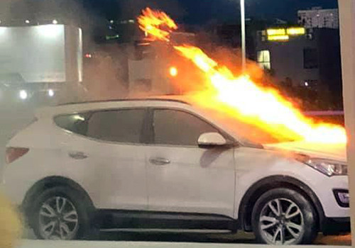 Chiếc Hyundai Santafe đang đỗ trên cầu vượt bất ngờ bốc cháy ở capô khiến nhiều hành khách hoảng sợ.
