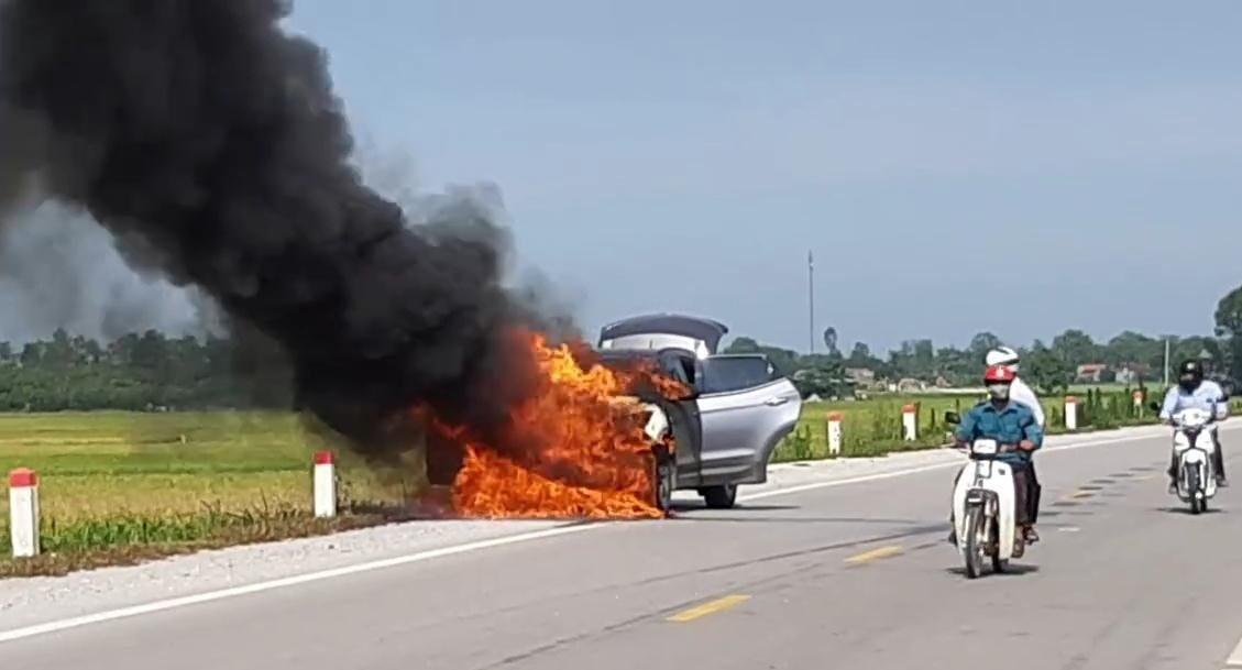 Sự việc xảy ra vào khoảng 15h ngày 22/5 trên đường nối Khu kinh tế Nghi Sơn - Cảng hàng không Thọ Xuân, Thanh Hóa. Theo người quay clip, ô tô bị cháy là Mazda CX-5, thời điểm xe bốc cháy, 5 người trên xe đều thoát ra an toàn.
