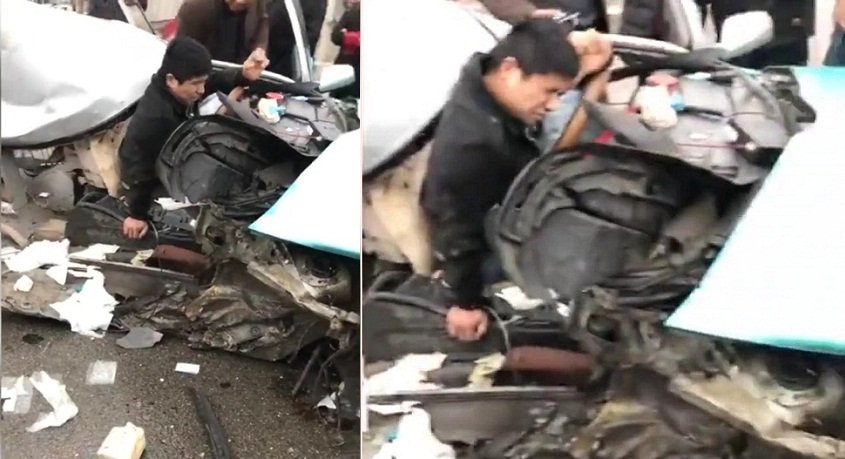 Clip hiện trường cho thấy ô tô con biến dạng, tan nát sau tai nạn nhưng nam tài xế Trung Quốc vẫn sống sót một cách kỳ diệu.