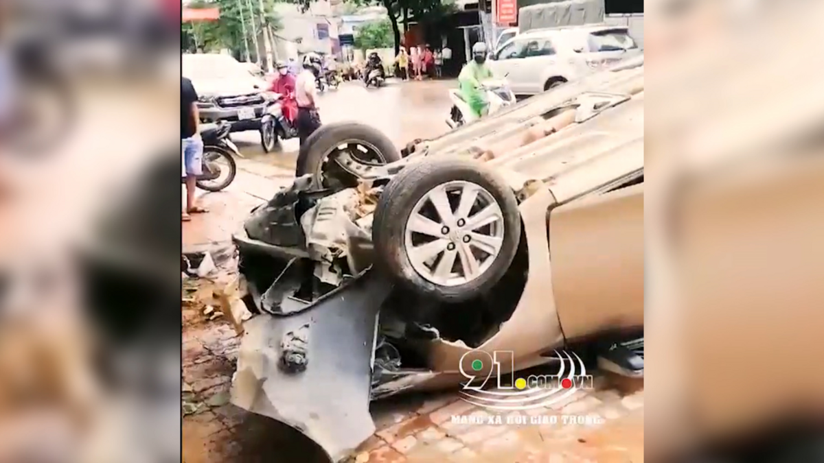 Chiếc ô tô chưa rõ BKS đang lưu thông trên Quốc Lộ 6, đoạn qua phường Quyết Tâm, TP. Sơn La phi lên vỉa hè rồi lật nghiêng.