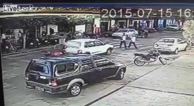 Một chiếc ôtô phanh gấp nhường đường cho hai người đi bộ đã khiến cho chiếc môtô phía sau không kịp phản ứng, húc vào đuôi xe.