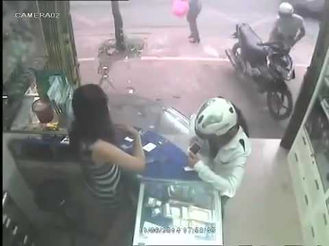 Nữ tặc vờ làm khách hàng vào hỏi mua điện thoại, căn lúc tên đồng bọn khởi động xe máy, ả liền chạy lên xe tẩu thoát nhanh như cắt khiến chủ cửa hàng không kịp trở tay.