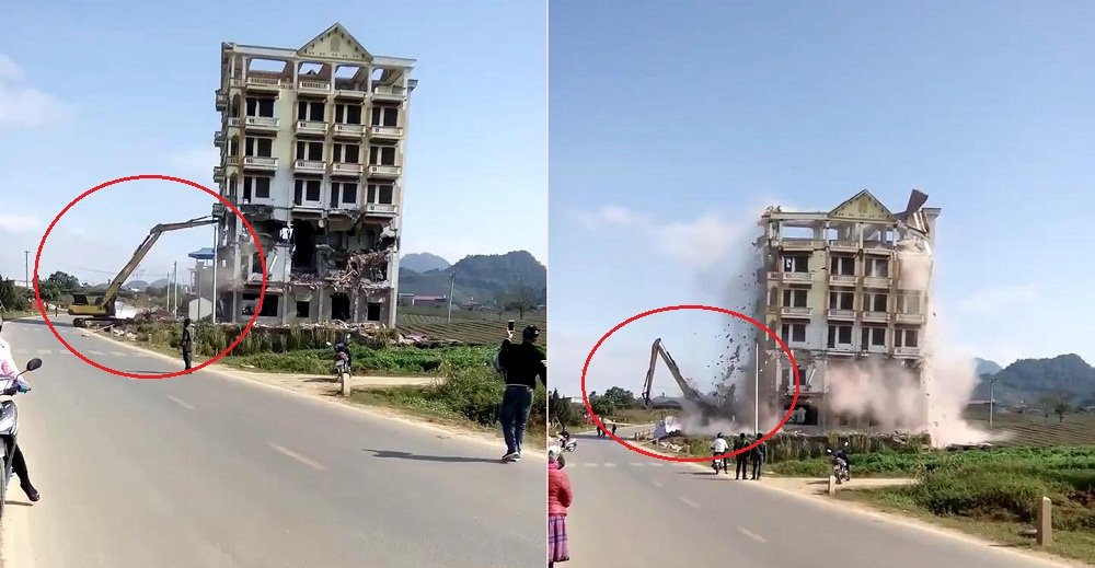 Trong lúc phá dỡ tòa nhà của trùm ma túy Tráng A Tàng (Tàng KeangNam) giữa cao nguyên Mộc Châu (Sơn La), tòa nhà 7 tầng bất ngờ đổ sập, một mảng bê tông lớn rơi xuống đè một phần máy xúc.
