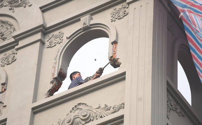 Lãnh đạo UBND phường Trung Văn (Nam Từ Liêm, Hà Nội) xác nhận, từ 14h chiều 12/3, lực lượng chức năng của phường đã có mặt và tiến hành phá dỡ phần sai phạm ở căn biệt thự của gia đình ông Nguyễn Thanh Hóa.