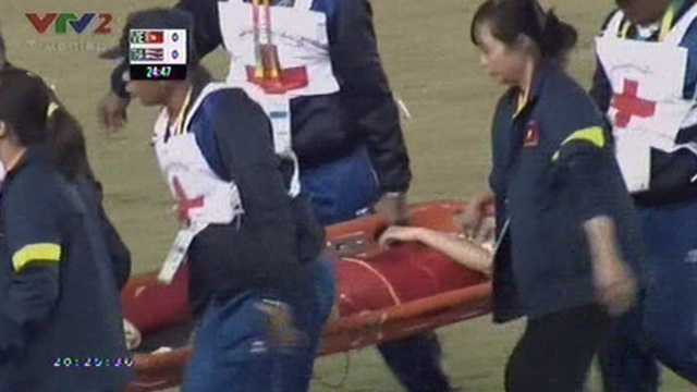 ÁC Ý! Đội bạn có pha cao chân trúng mặt Thanh Hương. Cô đã bị chảy máu khá nhiều và được cáng ra ngoài sân.