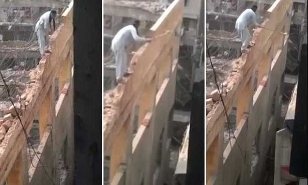 Người đàn ông vô tư đứng trên bức tường mỏng manh, cao ngút và dùng búa để đập phá từng mảng tường dưới chân mình.