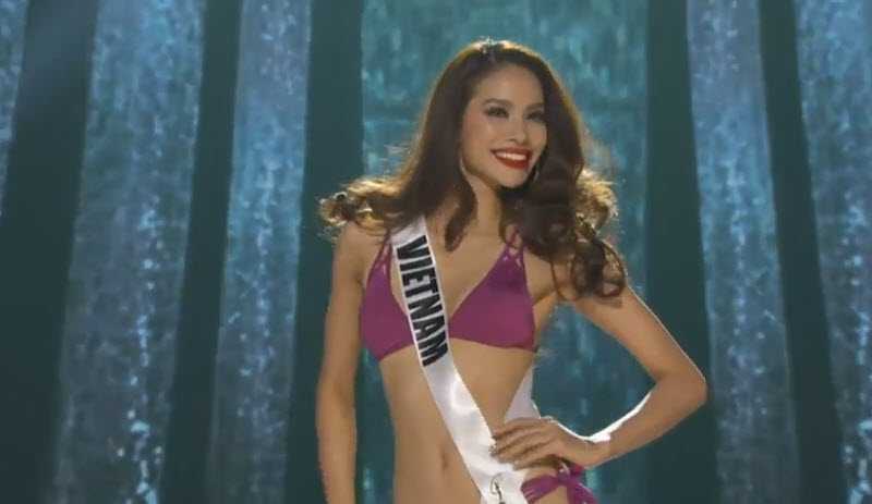 Bán kết Miss Universe 2015-Đại diện Việt Nam Phạm Hương tự tin sải bước trên sàn diễn trong trang phục áo tắm gợi cảm, cô cao 1m72,5, số đo 3 vòng 80-61-91cm.