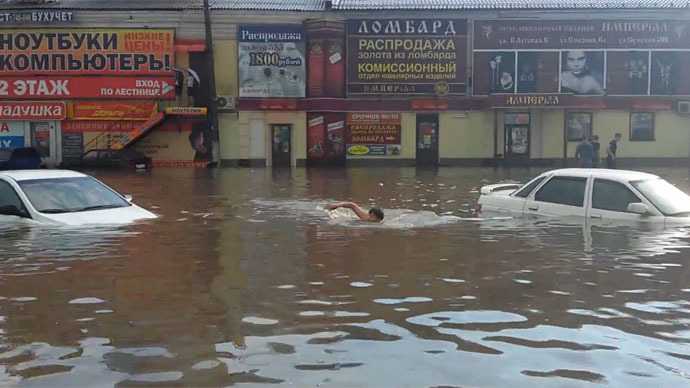 Cơn mưa lớn đã nhấn chìm một số thành phố ở Nga hôm 20/6 khiến việc đi lại trở nên khó khăn, có người còn phải bơi trên phố để tiếp cận được ô tô của mình.