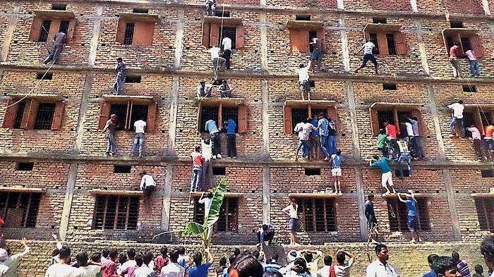 Phụ huynh tại Ấn Độ trèo tường bên ngoài hội đồng thi ở Bihar vào năm 2015 để "tuồn" bài giải cho các thí sinh bên trong.
