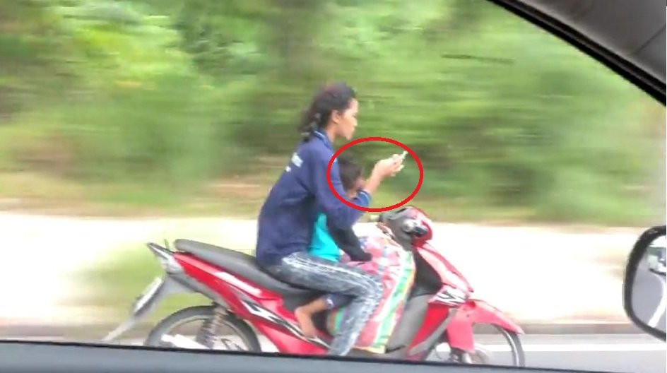 Người phụ nữ ở Phuket (Thái Lan) lái xe máy đèo bé gái phía trước, thản nhiên buông cả 2 tay nhắn tin điện thoại khiến người đi đường hoảng hồn.