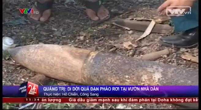 (VTC News) - Một đầu đạn pháo có chiều dài hơn 1m bất ngờ rơi xuống vườn nhà dân tại thị trấn Lao Bảo, Quảng Trị vừa được Ban Chỉ huy Quân sự thị trấn Lao Bảo di dời về nơi an toàn.