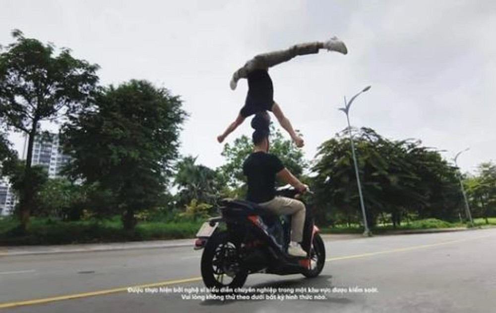 Đoạn video quảng cáo gây tranh cãi hình ảnh diễn viên không đội mũ bảo hiểm, làm xiếc trên xe.