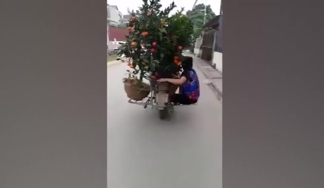 Chiếc xe máy một bên chở chậu quất nặng trịch được giữ thăng bằng nhờ trọng lượng của người phụ nữ đang đu bám ở phía bên kia.