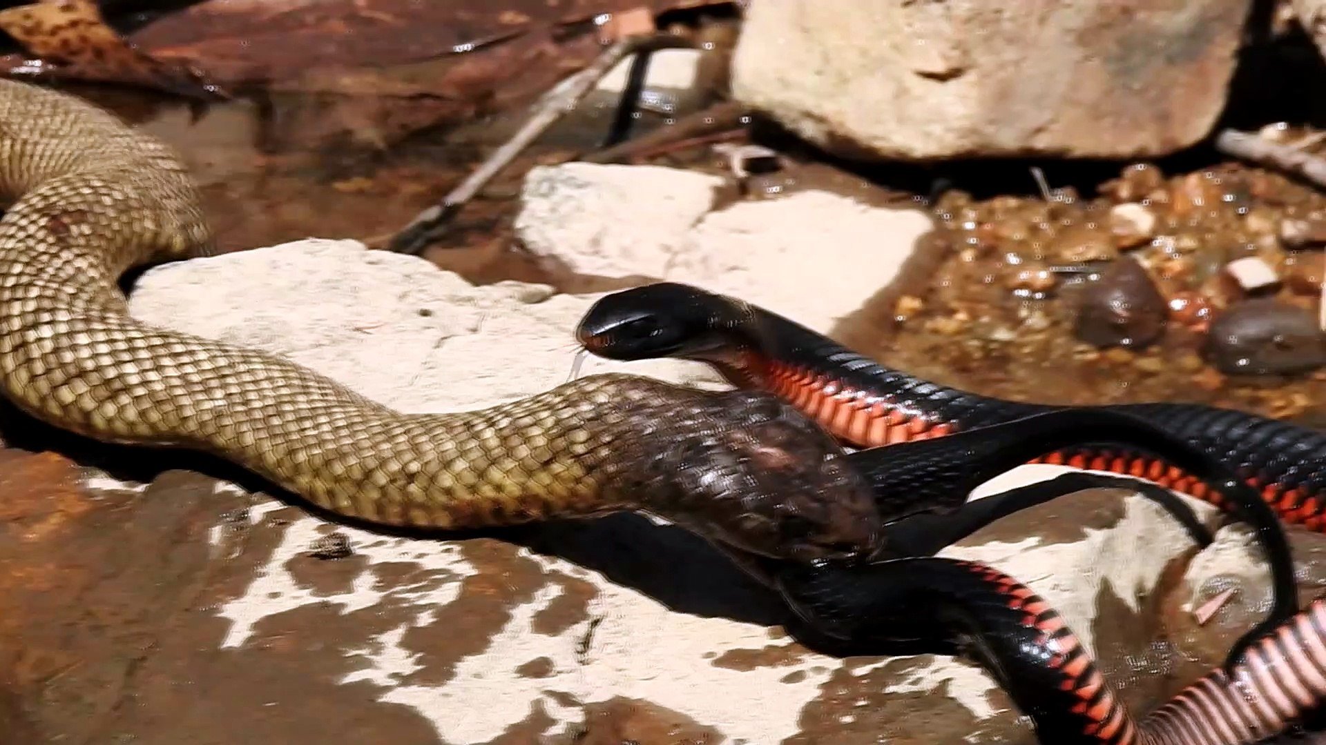 Rắn đen đốm ngoạm chặt đuôi rắn đen bụng đỏ, liên tục tiêm nọc độc, biến đồng loại nhỏ hơn thành bữa trưa ngon lành của mình.