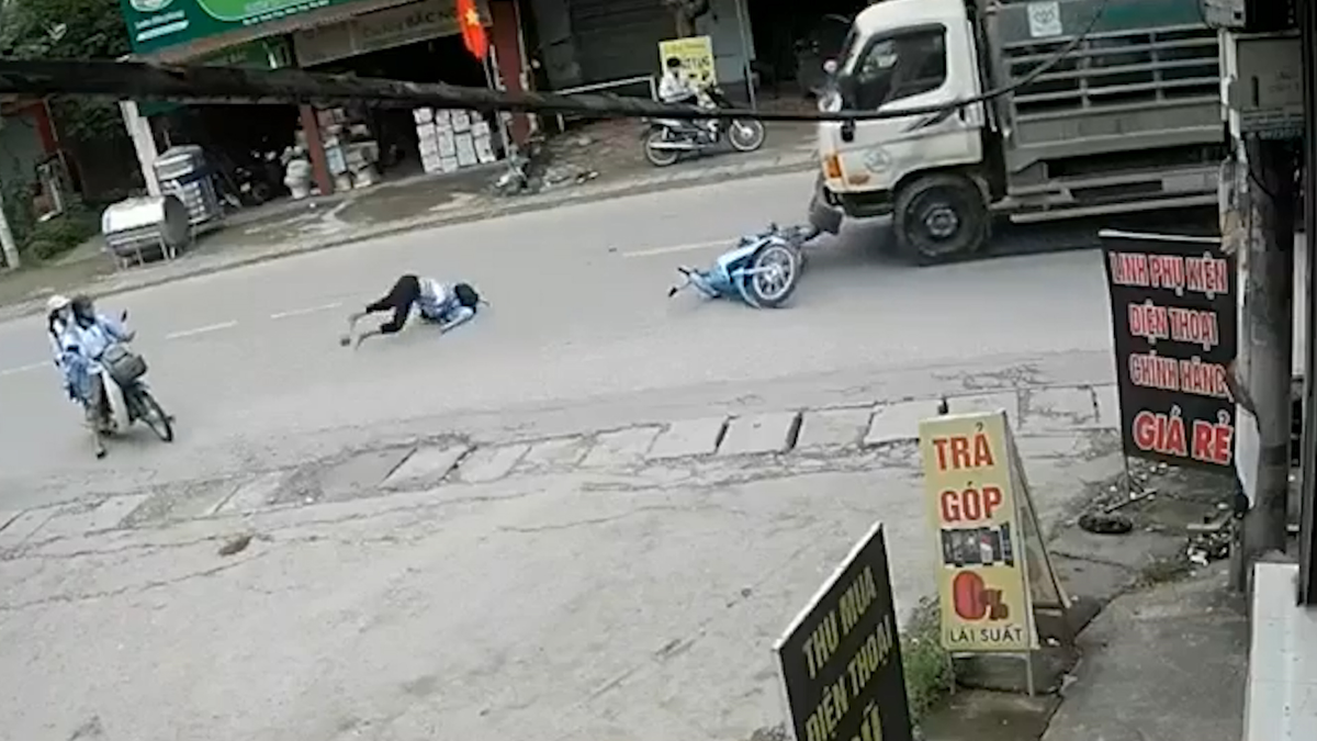 Sang đường thiếu quan sát, nữ sinh đi xe đạp điện bị ô tô tải tông mạnh, văng xuống đường tại một ngã ở Phú Bình, Thái Nguyên.