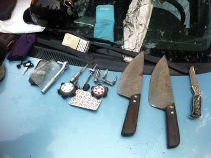 (VTC News)- Qua kiểm tra, đội đặc nhiệm 141 phát hiện một "kho" vam phá khoá và 3 con dao chọc tiết lợn dắt trong người và trong cốp xe 2 đối tượng.