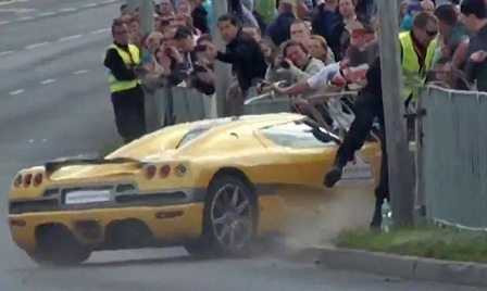 Đoạn video ghi lại hình ảnh chiếc xe thể thao đang chạy nhanh trên đường bỗng nhiên gặp sự cố, húc đổ hàng rào ngăn cánh và lao vào đám đông người đang đứng xem.