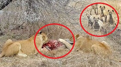2 sư tử cái đang say sưa ăn thịt lợn rừng trong Công viên quốc gia Kruger (Nam Phi), bất ngờ bị bầy linh cẩu xông vào tấn công, cướp mồi trắng trợn.