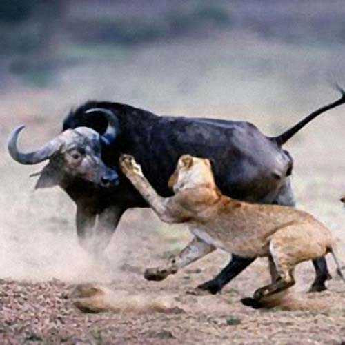 (VTC News)- Sư tử rình rập, nhân lúc cả đàn trâu rừng sơ ý, nó nhảy đến xơi tái chú nghé con.