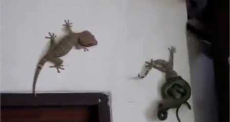 Một con rắn độc quấn chặt con tắc kè. Trước tình thế thấy bạn mình lâm nguy, con tắc kè bên ngoài đã dũng cảm tấn công tới tấp con rắn khiến nó buộc phải buông mồi.