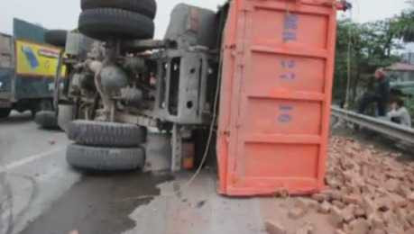 Clip: Tài xế mất lái, xe tải chở gạch lật úp