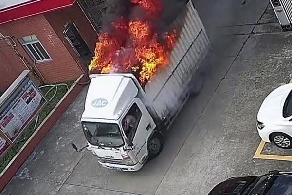 Khi nhận ra có khói bốc lên ở thùng sau, tài xế dũng cảm chạy xe tới trạm cứu hỏa địa phương chỉ cách vài phút lái xe. Lửa bùng lên rất nhanh và khi chạy qua cổng trạm cứu hỏa, xe trông như một ngọn đuốc.