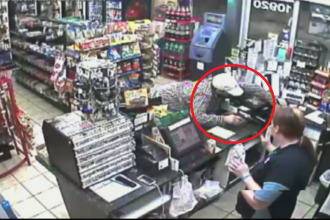 Tên cướp giả vờ mua đồ rồi ra quầy thanh toán. Khi nhân viên bán hàng mở ngăn kéo đựng tiền, hắn bất ngờ lôi súng ra và vơ vội số tiền rồi chuồn đi.