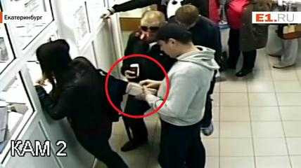 Cô gái chen vào quầy để thắc mắc vấn đề gì đó mà không xin phép những người đang xếp hàng, người đàn ông liền rút ví của cô này, lấy một tờ tiền rồi trả lại ví vào trong balo.