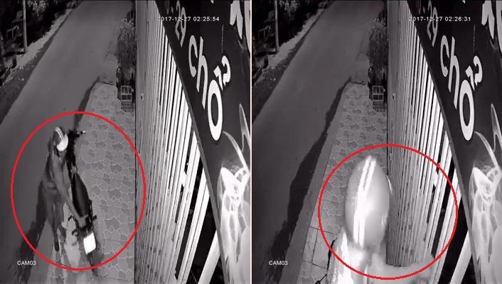 28/12/2017 11:22:00 +07:00Nam thanh niên đội mũ Grabbike đứng trên xe máy, luồn tay qua kẽ cửa trộm chim trong lồng rạng sáng 27/12 bị camera nhà dân ghi lại.