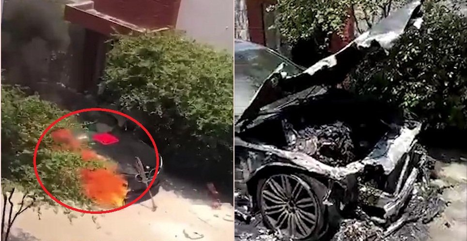 Sự việc xảy ra ngày 12/6 tại TP Dương Châu, tỉnh Giang Tô, Trung Quốc. Cảnh quay từ clip cho thấy, trước khi hỏa hoạn xảy ra, chủ xe phủ một mảnh vải đỏ lên mui xe.