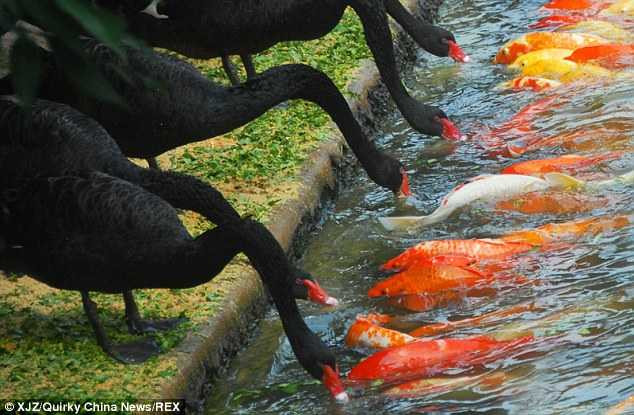 | Hình ảnh rất giống như thiên nga đen đang cho đàn cá chép ăn. |