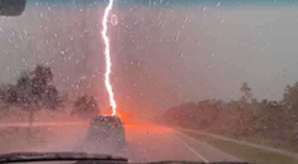 Khoảnh khắc tia sét giáng mạnh xuống đường cao tốc rất gần những ô tô đang di chuyển, khiến nhiều người hoảng hồn.