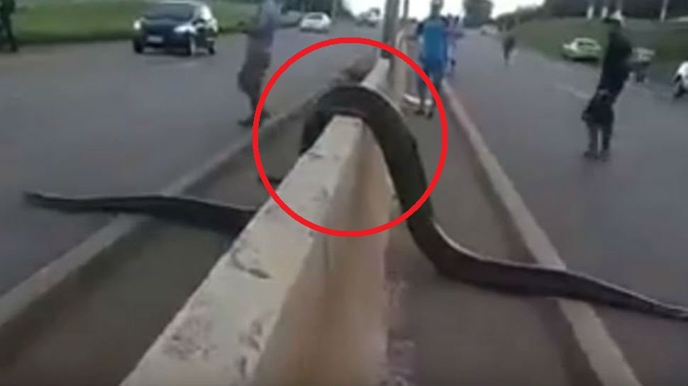Clip ghi lại sự việc xảy ra ngày 22/4 trên một con đường ở TP Porto Velho, bang Rondônia, Brazil. Con trăn anaconda dài hơn 3m, nặng khoảng 30kg thu hút sự chú ý của nhiều người đi đường.