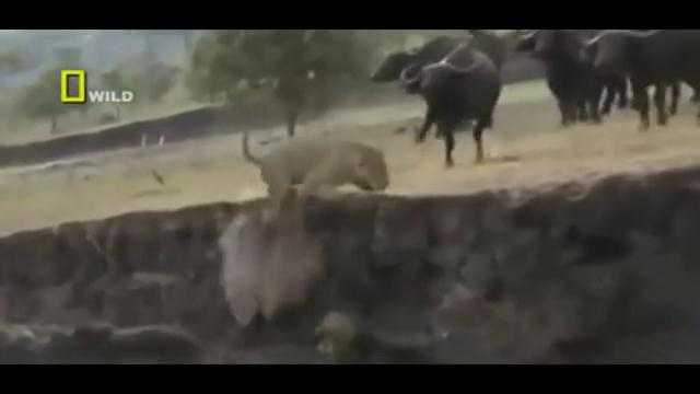 Sư tử bị đàn trâu rừng cả trăm con rầm rập tấn công đã luống cuống ngã xuống vực.