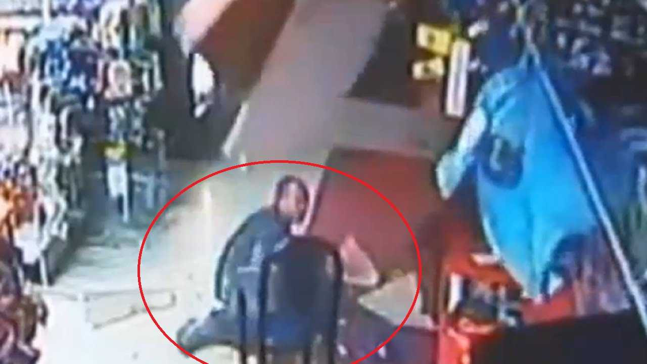 Camera giám sát của cửa hàng cho thấy sau khi rơi qua trần nhà và đáp xuống bên trong cửa hàng, tên trộm ngay lập tức cố gắng bám dây trèo lên trở lại.