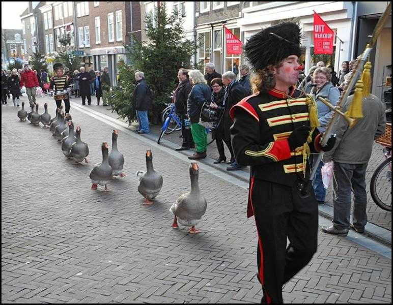 Những con ngỗng xếp hàng ngay ngắn bước đi “rầm rập” theo nhịp trống của người lính trên đường phố Hà Lan khiến người dân thích thú.