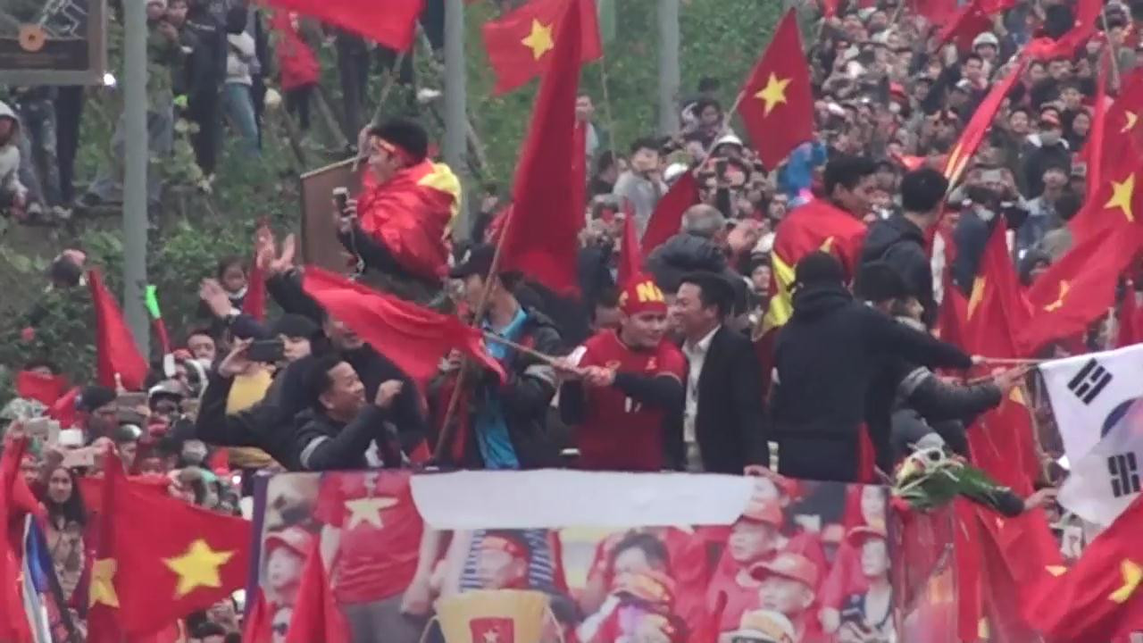 Khoảng 16h15, xe buýt mui trần chở U23 Việt Nam về đến đường Võ Chí Công, hàng vạn người dân đổ ra đường, hò hét chạy theo xe cổ vũ.