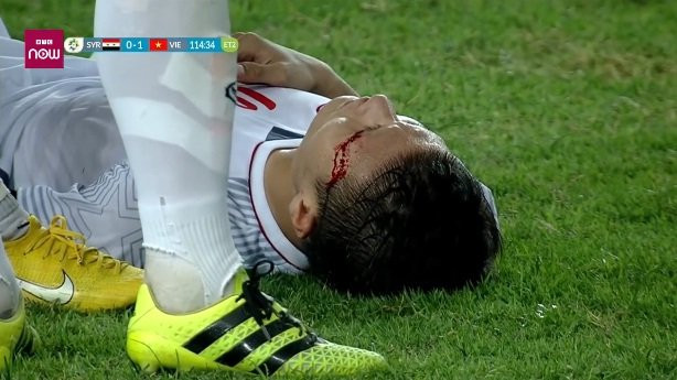 Trong nỗ lực ngăn chặn cầu thủ Olympic Syria tung ra cú sút, Quang Hải đã lĩnh trọn cánh tay của đối thủ, bị rách mi mắt và chảy rất nhiều máu.