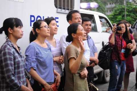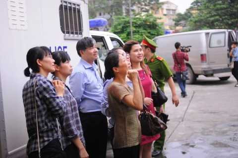 | Vợ và con gái ngóng vào xe tù để động viên ông Dương Chí Dũng. |