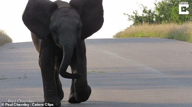 Trong đoạn video, đàn voi con đang tung tẩy băng qua đường ngay phía trước chiếc ô tô chở nhóm du khách kể trên. Nhận thấy có người quan sát mình, chú voi bé nhất kêu lên và chạy nhanh về phía chiếc xe, như thể sẵn sàng lao thẳng vào đó.