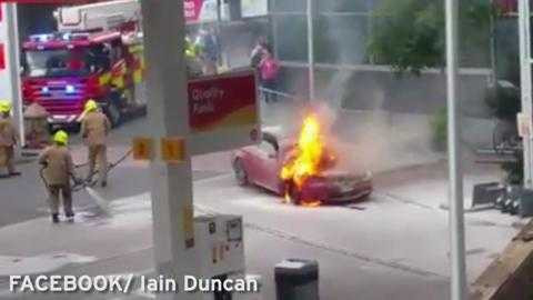 Chiếc BMW màu đỏ bốc cháy ngùn ngụt với ngọn lửa bắt nguồn từ khoang động cơ, điều kinh hoàng hơn là đám cháy này chỉ cách trạm xăng vài mét.
