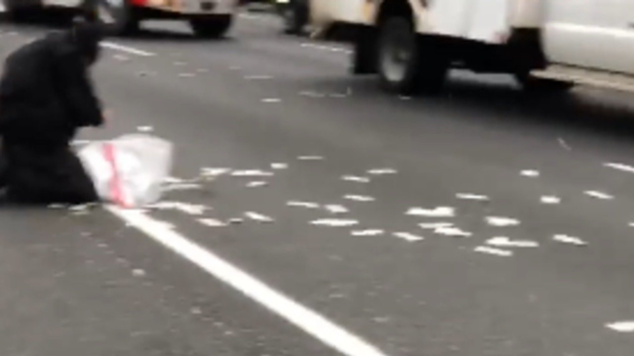 Tuyến cao tốc ở bang New Jersey (Mỹ) rơi vào cảnh hỗn loạn nghiêm trọng sau khi một xe chở tiền bung cửa sau, làm bắn văng các tờ USD ra ngoài.