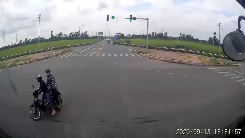 Xe máy chở hai người khi đến ngã tư quốc lộ 38A, Hưng Yên đột ngột chuyển hướng, khiến xe container phải phanh gấp tránh tai nạn.