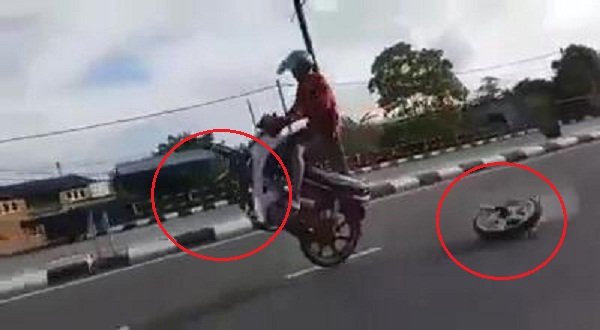 Bánh trước xe máy long sòng sọc khi bốc đầu khiến "quái xế" tiếp đất bằng mặt đầy đau đớn.